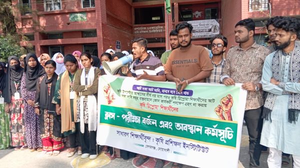 নোয়াখালী প্রতিনিধি: নোয়াখালী কৃষি প্রশিক্ষণ ইনস্টিটিউটের (এটিআই) শিক্ষার্থীরা আট দফা দাবিতে ক্লাস-পরীক্ষা বর্জন করে অবস্থান কর্মসূচি পালন করেছেন। বৃহস্পতিবার (৪ ডিসেম্বর) বেলা সোয়া ১১টার দিকে নোয়াখালী কৃষি প্রশিক্ষণ ইনস্টিটিউট প্রাঙ্গণে
